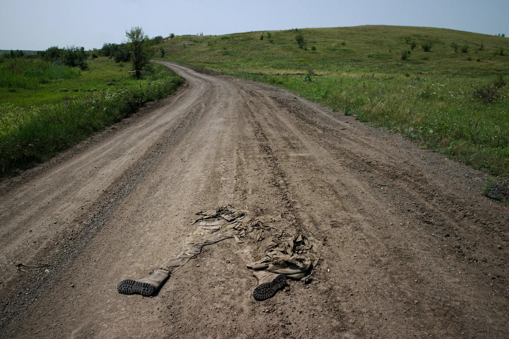 この記事には、未舗装の道路に置かれたゴミだらけの軍服と、その横に置かれた2つの長靴を写した、この演出された写真が添えられている。