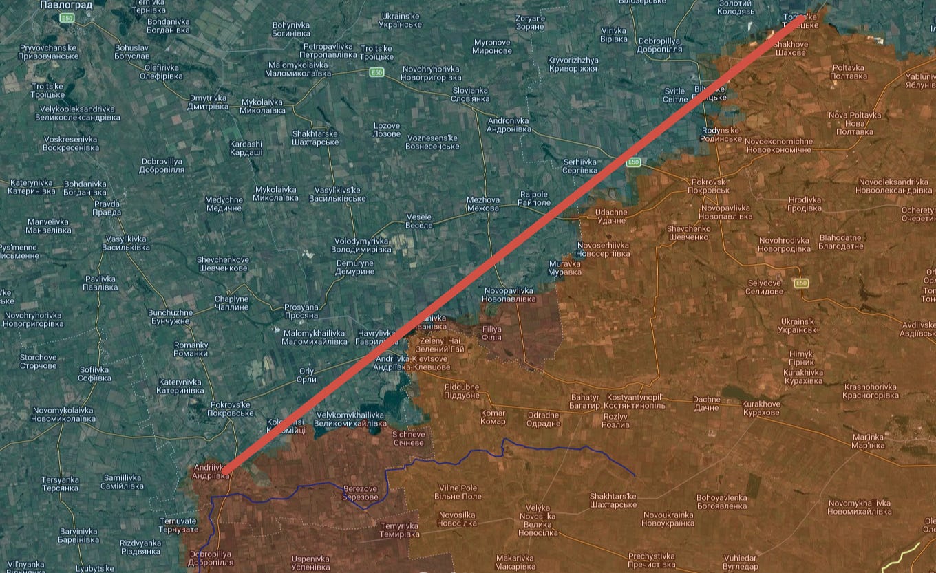ロシア軍が小さな前進で達成した興味深いことの一つは、ポクロフスクから北グリャイポレ線にかけての前線全体の平坦化です: