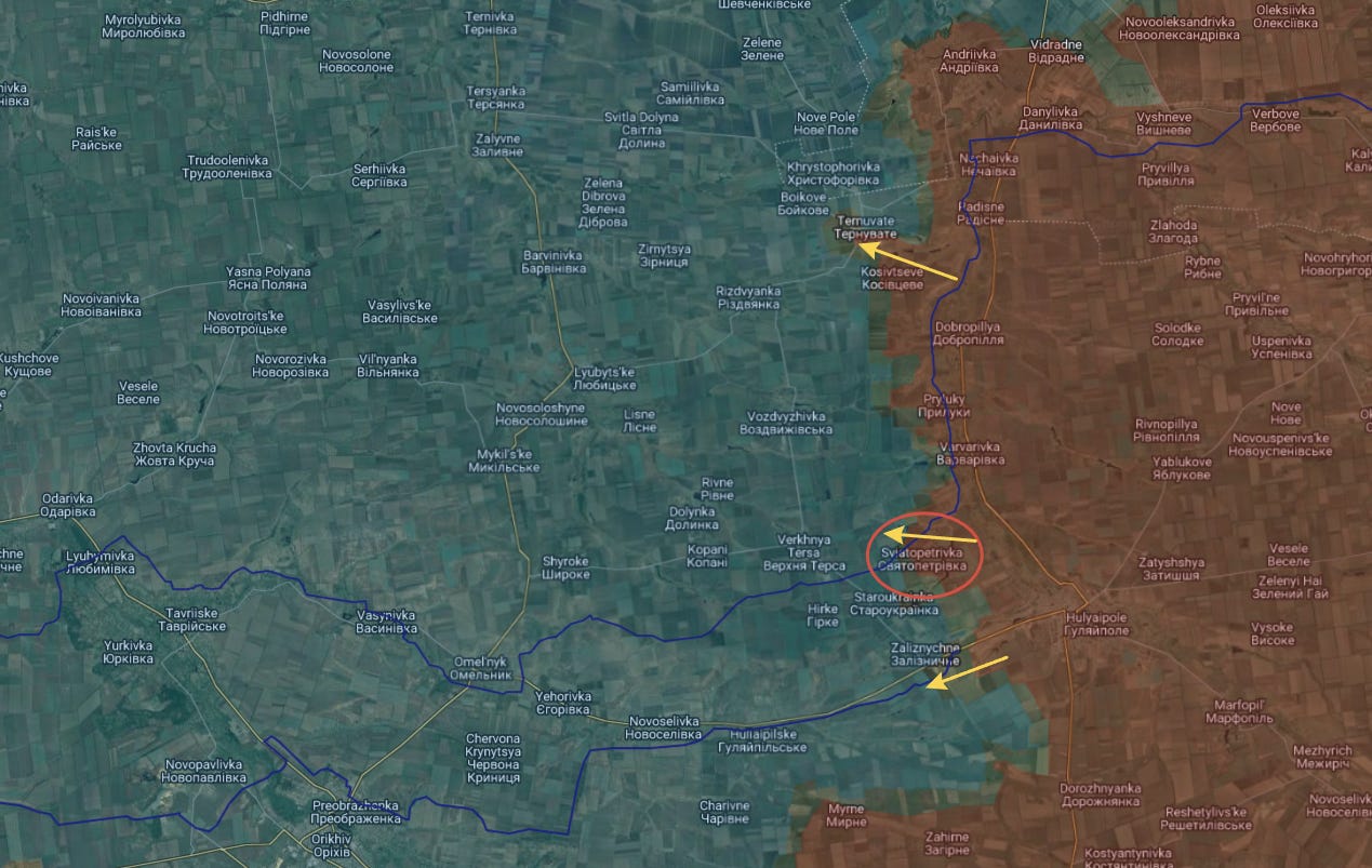 特に注目すべきは、ザポロージェ州東部のグリャイポレ方面から「東部特急」が動き出し、スヴャトペトロフカ(ペトロフカとも呼ばれる)を占領したことです。