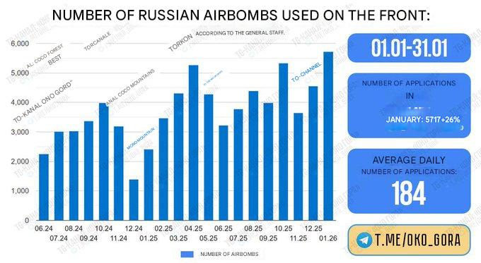 ウクライナのメディアは、1月にロシアが発射した航空爆弾の総数と弾道ミサイルの両方で記録を樹立したと報告しています。爆弾(Fab滑空爆弾、Kab等)に関しては、1月に5,717発発射されたとされ、1日平均184発に相当します: