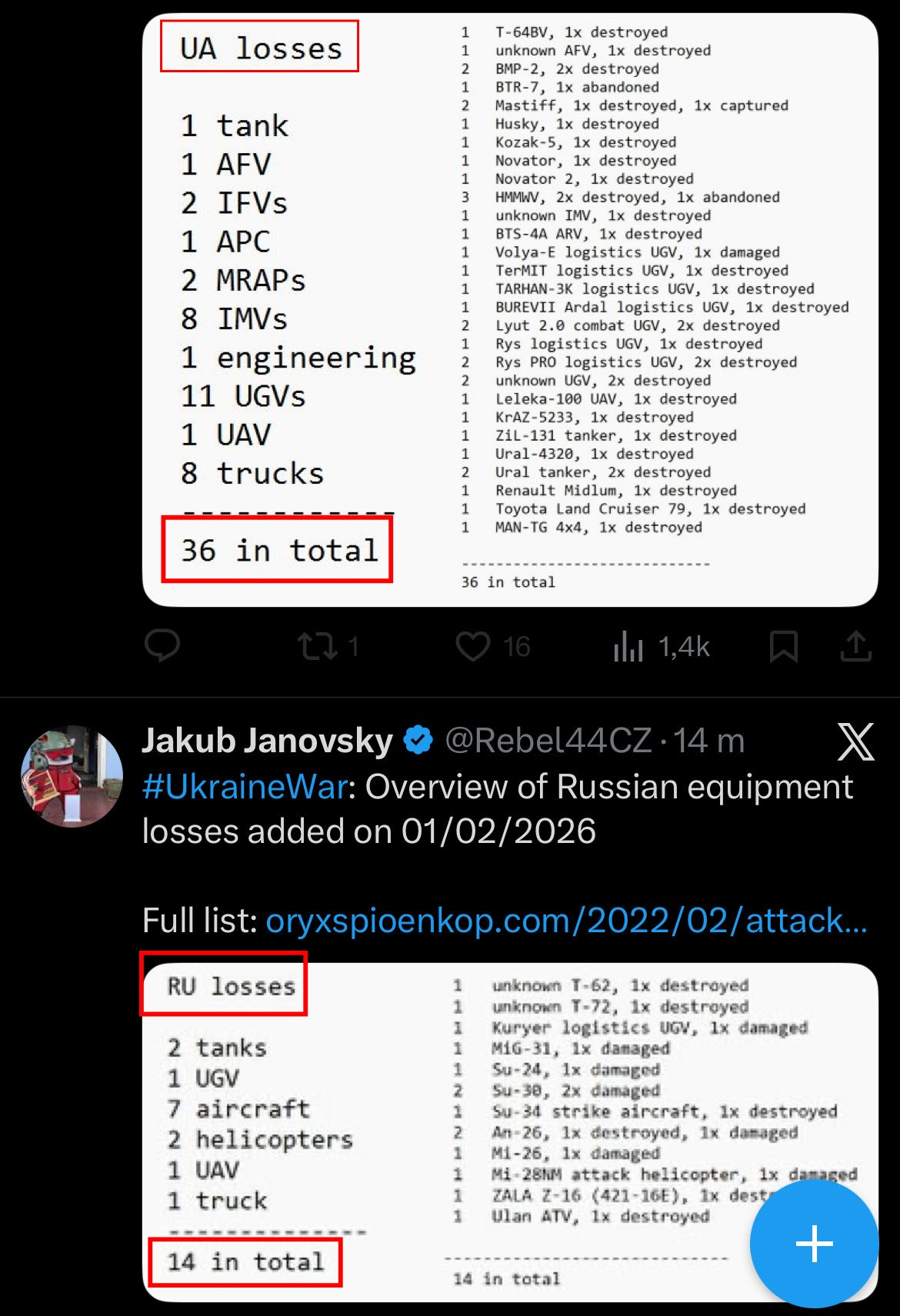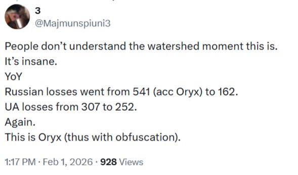 もう一つの厳しい節目は、公式のOryx損失統計でも2ヶ月連続で、ウクライナがロシアと比較して月あたりの車両損失がはるかに多いという事実です: