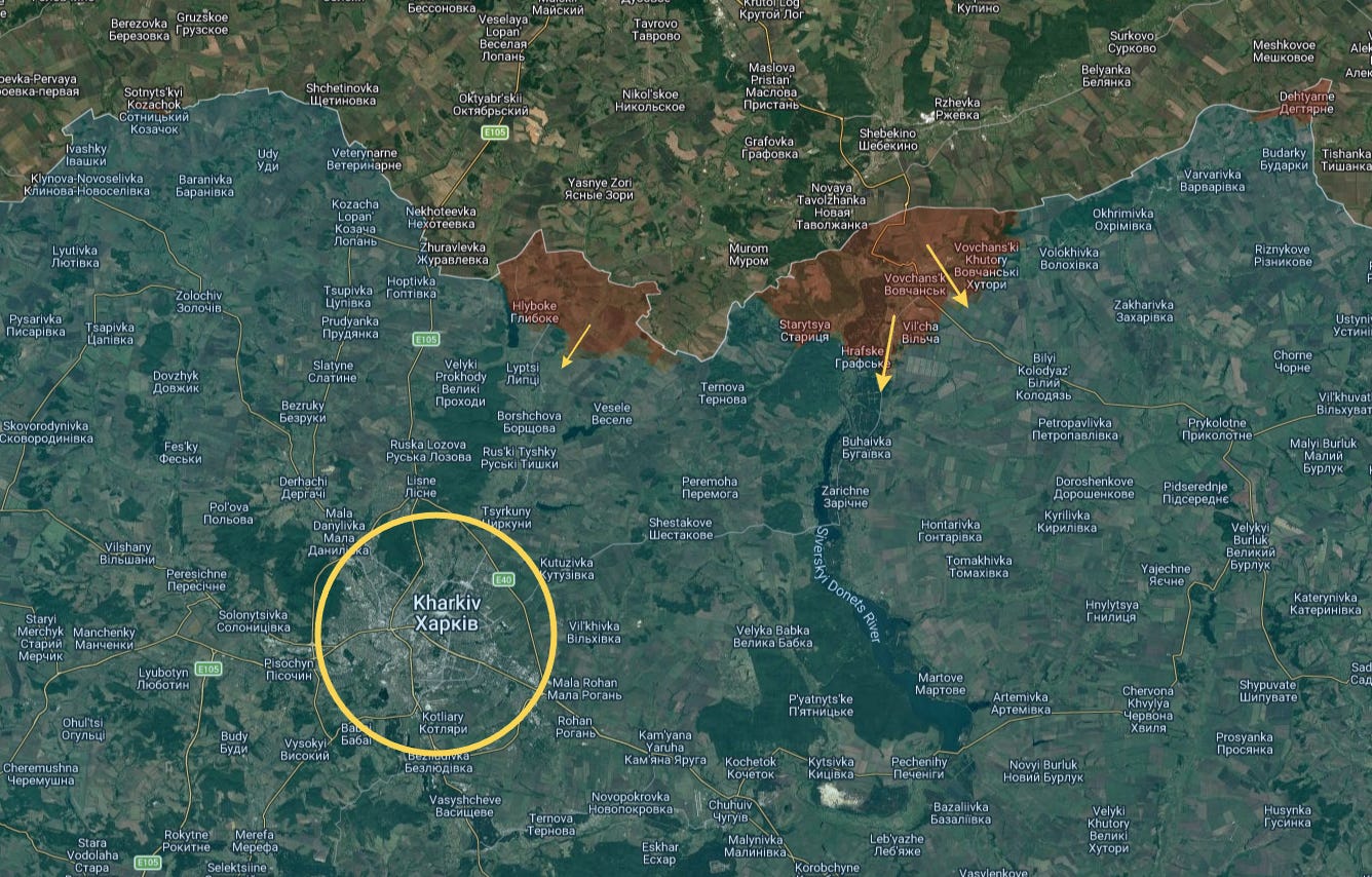ヴォフチャンスクを完全に占領した後、ロシア軍は現在セヴェルスキー・ドネツ川沿いにゆっくりと南下し、シミニフカとグラフスケのほとんどを占領しました。下の黄色い矢印で示されています: