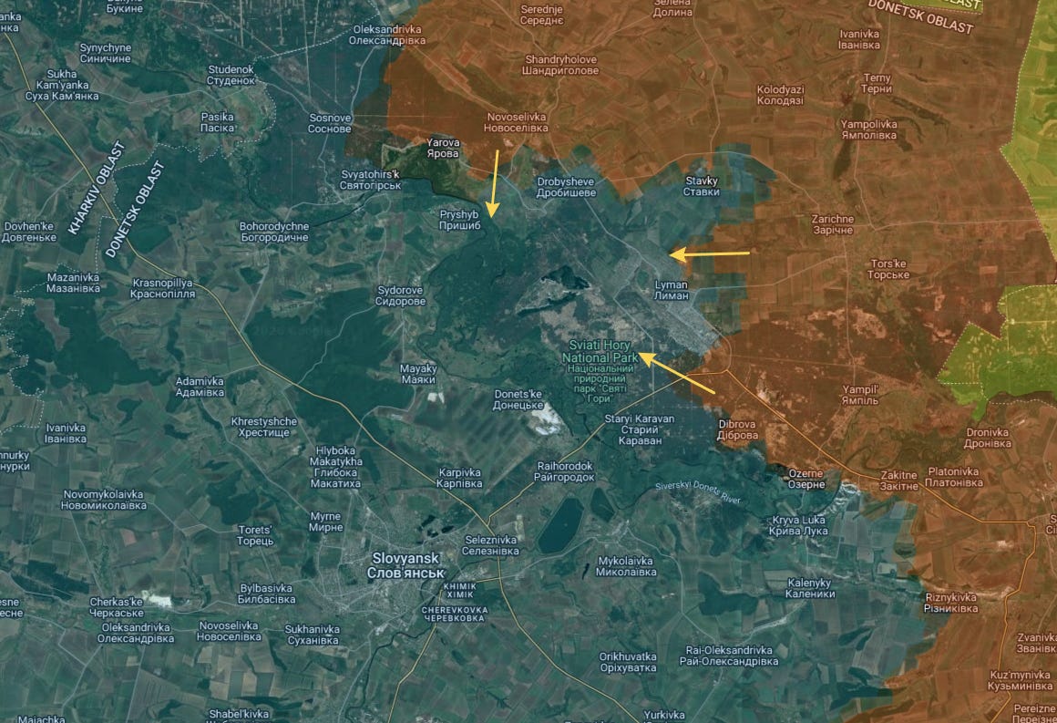 北部では、リマンは三面を包囲され、窒息状態になっています。ロシア軍は東側の死地のほとんどを占領しただけでなく、毎日漸進的に拡大している新たなスヴャトゴルスク方面から北西に回り込んだ後です: